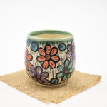 This tumbler is thrown on the wheel using porcelain stoneware clay in our studio, located in Calgary, Alberta. The graphic on the tumbler has been hand-carved into the surface using the sgraffito technique, which involves covering the tumbler’s surface with our handmade black slip and carving away until the image is finished. This means you can feel the slightly raised, carved texture as you wrap your hands around a stemless glass of wine, or an ice-cold lemonade at the end of a long day. While we create different series of designs each tumbler is made and decorated individually, so that no two pieces are identical, and each design is matched with one of our brightly coloured glazes.