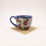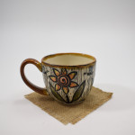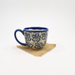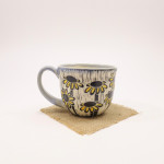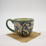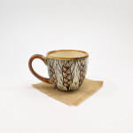 This teacup is thrown on the wheel using porcelain stoneware clay in our studio, located in Calgary, Alberta. The graphic on the teacup has been hand-carved into the surface using the sgraffito technique, which involves covering the teacup’s surface with our handmade black slip and carving away until the image is finished. This means you can feel the slightly raised, carved texture as you wrap your hands around a cozy cup of tea or a latte. While we create different series of designs each teacup is made and decorated individually, so that no two pieces are identical, and each design is matched with one of our brightly coloured glazes.